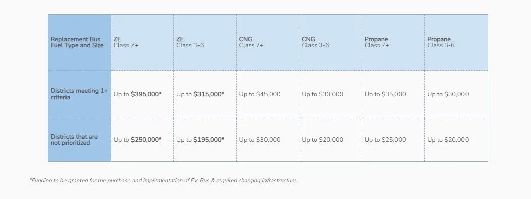 As we mentioned before, any school district in America can apply for and potentially receive funding for low- or no-emission school bus projects through this EPA grant. However, the breakdown of how much money a location can receive through this program is based largely around the prioritization criteria listed above as well as the type of vehicle(s) they intend to acquire. Here is a table of how the funding breaks down per vehicle acquired through the program: