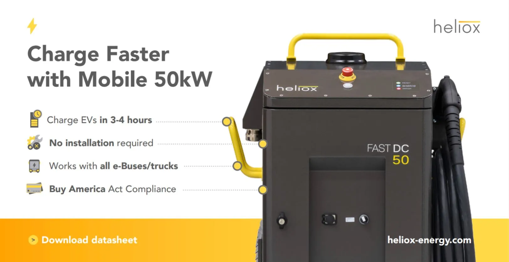 With a charging solution like the Mobile 50 kW, you can enjoy the reliability of industry leading Heliox DC fast chargers without the need for installation. This not only helps you save on upfront costs, but it also offers greater flexibility when designing the EV section of your depot. Without any worries about hardwiring, you can easily reposition the EV charging area in your bus yard as needed.