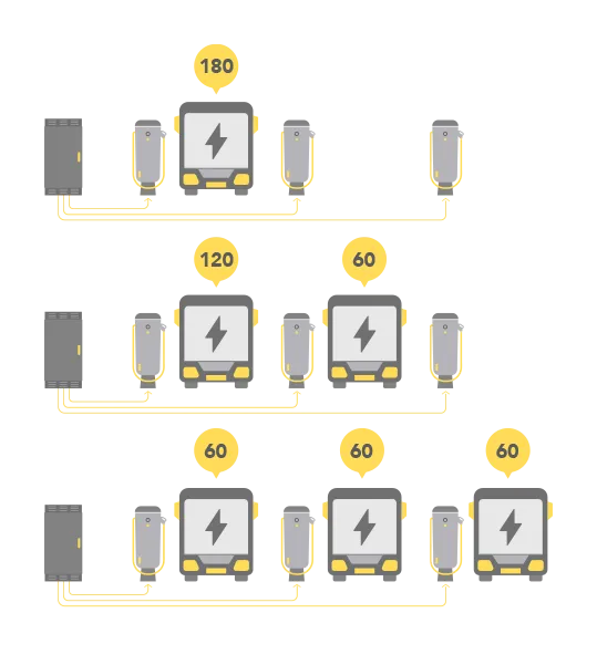 Dynamic power management allows for shifting power between charge points as EVs need less and less power towards the end of a charging session; this power can be “released” to a next vehicle.